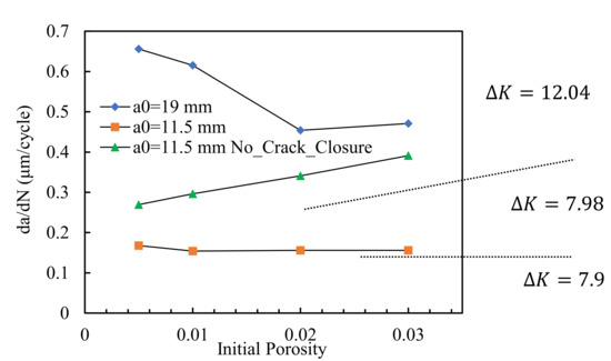 Fatigue crack growth rate in terms of the initial porosity for two distinct crack lengths (a0 = 11.5 mm and a0 = 19 mm). Results are shown in natural scales. Nucleation and coalescence are disabled. (q1 = 1.5, q2 = 1, q3 = 2.25, Fmax = 41.67, Fmin = 4.17, R = 0.1, plane strain state).