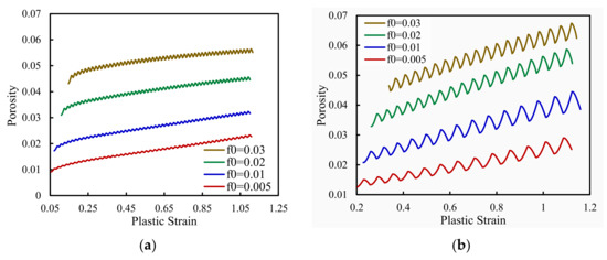 Porosity growth due to the accumulation of plastic strain for distinct values of for: (a) a0 = 11.5 mm and (b) a0 = 19 mm. Results are shown in natural scales.