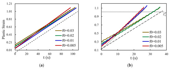 The evolution of the porosity is directly influenced by the material parameters adopted in the GTN model. However, the numerical model considers plastic strain to determine the crack propagation. Thus, this is the entity to be studied to explain the da/dN values shown previously. Figure 6 presents the plastic strain build-up in terms of pseudo-time. Note that the instants presented on the scale are relative to the beginning of the new propagation, the time was reset to allow the comparison of the 25th propagation, which due to the da/dN differences occurs at different instants of the simulation. Results are shown in natural scales. Again, Figure 6a is relative to a0 = 11.5 mm and Figure 6b to a0 = 19 mm. For the first initial crack length, plastic strain grows inside a narrow band, delimited by the traced lines, which explains the similar results of da/dN for the different values of . Note that for the lower initial porosity the plastic strain accumulation is slightly faster, departing from the linear trend followed by the other curves, which is in accordance with the da/dN results. Additionally higher values result in higher plastic strains at the beginning of the propagation, which agrees with the porosity outcomes. For a0 = 19 mm the plastic strain at the beginning of the propagation also rises with , however, overall, it is much higher for this initial crack length. The porosity levels are distinct for both initial crack lengths due to ΔK. Curves can be grouped in two groups: and , which result in a faster, slightly not linear, accumulation, in agreement with the faster da/dN; and lead to a slower, linear, plastic strain build-ups, and propagation rates. The da/dN results are, this way, well explained. However, explaining the plastic strain trends is the major challenge as it will close the questions loop.