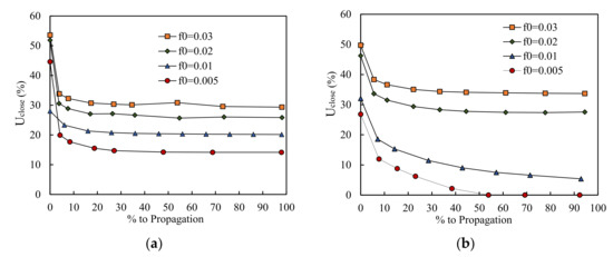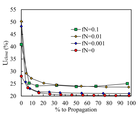 Figure 7a presents the crack closure for a0 = 11.5 mm while Figure 7b refers to a0 = 19 mm. Crack closure is evaluated as a function of propagation percentage. This scale is preferential to pseudo time, in this case, because all curves begin and end at the same point, improving the comparison between them. At 0% the accumulation begins and at 100% node release occurs. For a0 = 11.5 mm the crack closure trend is different for each value of explaining the also alike accumulations of plastic strain. Thus, higher porosities and higher plastic strains generate higher levels of crack closure, which protects the material from the lower mechanical resistance conferred by the higher porosity, levelling the plastic strain accumulation. The lower level of crack closure for results in a faster plastic strain build-up and consequentially a higher da/dN. In the case of a0 = 19 mm the same grouping, performed for plastic strain, can be made. The two lowest values of suffer smaller deformations inducing lower levels of crack closure. Strain ratcheting also occurs disabling the stabilization of crack closure. This allows a faster accumulation of plastic strain, especially for , where crack closure completely ceases, explaining the higher propagation rates. The second group, with higher values, has a much higher crack closure. Consequentially the plastic strain accumulation is delayed resulting in lower levels of da/dN. The obtained propagation rates are, this way, fully explained. Note that for this second group no strain ratcheting occurs. Thus, the disabling of this phenomenon must be related or with the higher or with the higher void growth rate experienced for higher values of .