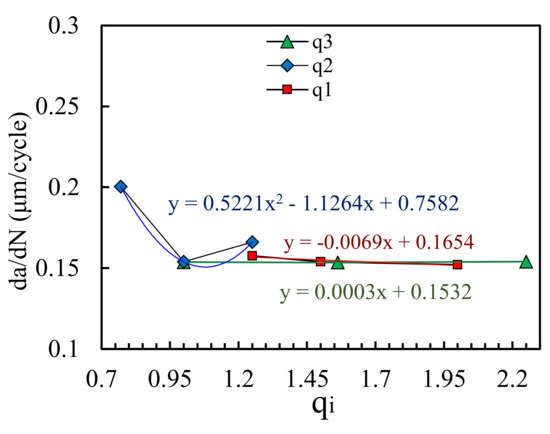 As referred, Tvergaard modified the Gurson’s model to account for micro-void interactions adding three additional parameters: q1, q2, and q3. Each one of these parameters has a specific effect on the growth of micro voids process. q1 accounts for the loss of strength due to the interactions occurring between different voids, q2 and q3 influence the effect of the stress triaxiality and void volume fraction, respectively, on the plastic potential. Tvergaard proposed standard values for these parameters that are widely used (q1 = 1.5, q2 = 1, q3 = 2.25). However, to not disregard the importance of these parameters they were also included in the sensitivity analysis. The effect of these parameters on the predicted da/dN is shown in Figure 8. Each curve represents one of the parameters and the results are presented in natural scales. The loading case is the same applied in the study of .