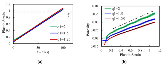 (a) Plastic strain evolution for distinct values of q1. The q1 = 2 curve is almost indistinguishable because it is overlapped by the others. (b) Porosity evolution due to the increase in plastic strain. Results are shown in natural scales.