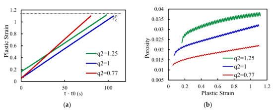 (a) Plastic strain evolution in terms of the distinct values of q2. (b) Porosity evolution, due to the increase in plastic strain, for the same values of q2 previously referred. Results are shown in natural scales.