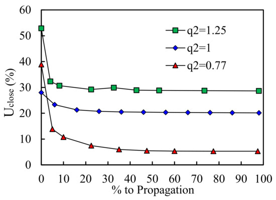 Crack closure level for distinct values of q2. Results are presented in terms of the percentage of load cycles completed to the load cycles needed to propagation to occur.