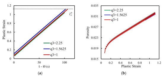 (a) Plastic strain evolution in terms of the distinct values of q3. (b) Porosity evolution, due to the increase in plastic strain, for the same values of q3 previously referred. Results are shown in natural scales.