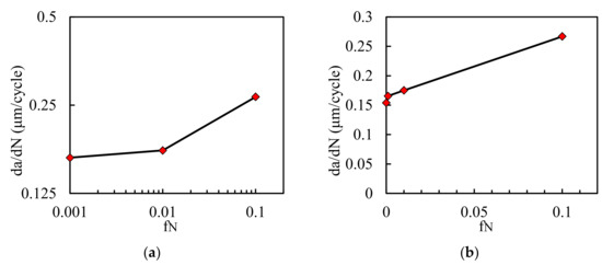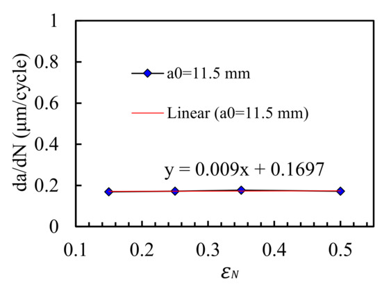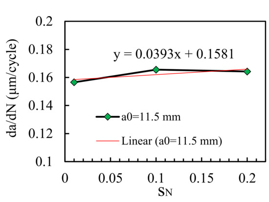 Varying the standard deviation of the distribution allows to model different ranges of plastic strain over which voids nucleate. Small standard deviations are supposed to cause the porosity to increase in a narrow band of strain increments, while higher deviations should smooth the nucleation process. Also, narrow ranges of nucleation, caused by small values of , were shown to have a destabilizing effect in the model [20]. To access the influence of these particularities on the fatigue crack growth rate, da/dN was calculated for different values of : 0.01, 0.1, and 0.2. The result is presented in Figure 18 in natural scales for the same initial crack length: a0 = 11.5 mm. The influence of this parameter is small—da/dN is basically independent of —as shown by the very small slope of the linear tend line. Although, for da/dN is higher than for the two remaining values.