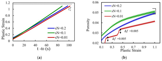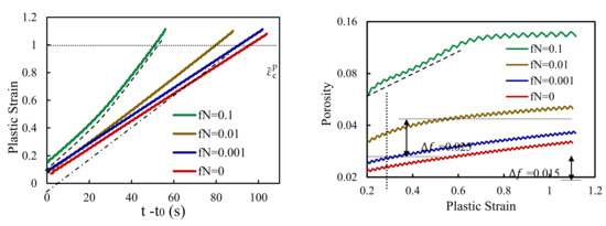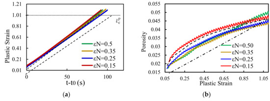 The void fraction to be nucleated by means of plastic strain rate, , influences the nucleation process by means of Equation (10). This parameter is related to the voids nucleated by debonding of the second phase particles, in this case, with dependence on the history of plastic strain. The physical meaning of this numeric parameter is that a total fraction, equal to , of new voids may be nucleated due to plastic strain.