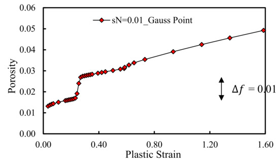 Porosity accumulation due to the occurrence of plastic strain at the Gauss point located immediately after the node containing the crack tip.