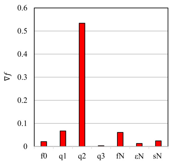 where is the sensitivity coefficient and represents the GTN material parameter. Each sensitivity coefficient represents the change rate of da/dN caused by a variation of a specific material parameter. Note that a sensitivity of 0.5 indicates that a variation of 1% in produces a variation of 0.5% in . The results obtained in the sensitivity analysis are presented in Figure 21. The sensitivity analysis was performed at the central point, or at one of the central points in the case where even number of values for the parameter were studied. Results show that q2 parameter has by far the biggest influence on da/dN. q1 is also important while q3 has almost no influence. is the nucleation related parameter with most importance, followed by and finally . has also low importance.