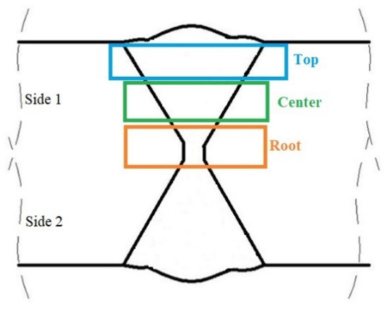 Locations for the transverse tensile test—Top means the upper part of the weldment, center is the central part of the weldment in the side, and root refers to the X root. The other side of the weld is considered symmetric.