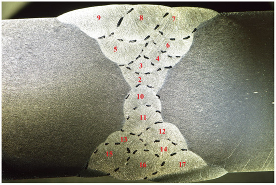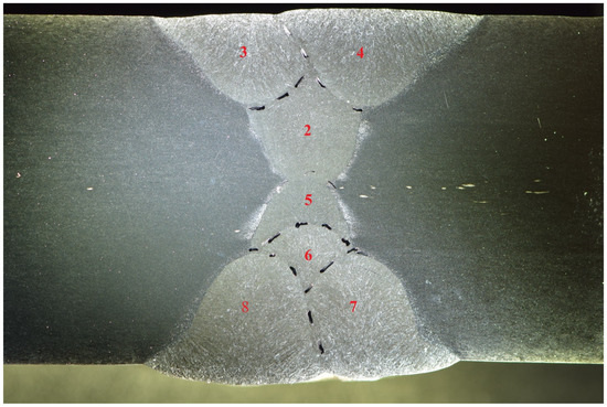 Welding sequence in weldment SA-H. Weld pass 1 is not visible, probably re-melted by both weld pass 2 and weld pass 5.
