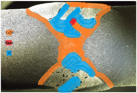 Therefore, it can be concluded that the larger number of welding passes (reheating cycles) in the immediate vicinity of a deposited weld pass, the higher the possibility for sigma-phase to form. That agrees with previously published works [12,13].