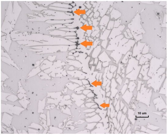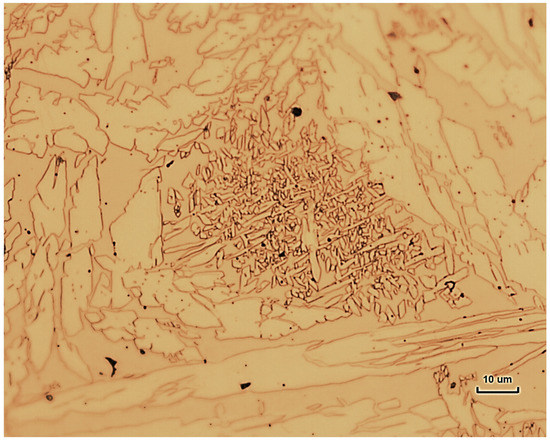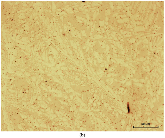 Eight weld passes were used in the preparation of the SA-H weldment (Figure 7). Weld pass 1 was not visible, as it was re-melted by weld pass 5 and probably partly by weld pass 2. Figure 8 shows the location of intermetallics and secondary phases observed. Sigma-phase was not found in the weld metal of the cross-section inspected. However, nitrides were found in weld passes 4, 5, and 6, and intragranular secondary austenite was found to a greater extent in weld passes 2, 3, 6, and 7. The re-heating caused the growth of the primary austenite (intergranular and Windmanstätten). That is illustrated in Figure 9, showing the comparison between the microstructure of the non-reheated weld pass 8 and the weld pass 6, which was re-heated twice. Secondary austenite was found in specific areas of the reheated High-Temperature Heat Affected Zone (HT-HAZ) of the SA-H weldments (Figure 10), and nitrides were found in the Low Temperature Heat Affected Zone (LT-HAZ).