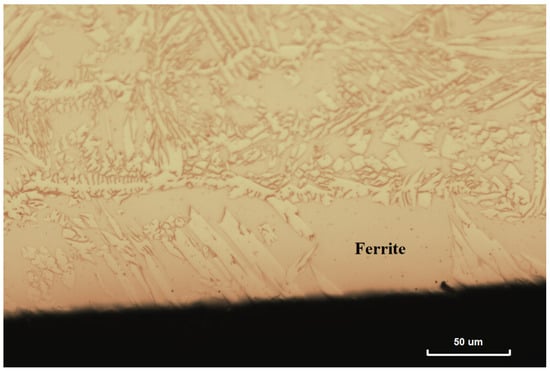 Table 3 presents the average ferrite content values evaluated by using image analysis in the HAZ and the overall weld metal. In the weld metal, the average ferrite values are detailed in three zones: the root, the center, and the top (see Figure 1). The ferrite measurements in the HAZ were performed in areas between the fusion line and the unaffected base metal, as described in Section 2.2.