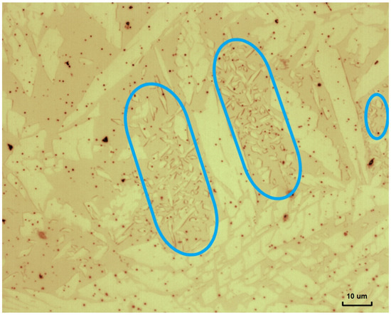 Secondary austenite (some areas marked with blue circles) in weld pass 3 close to the boundaries with weld passes 4 and 5.