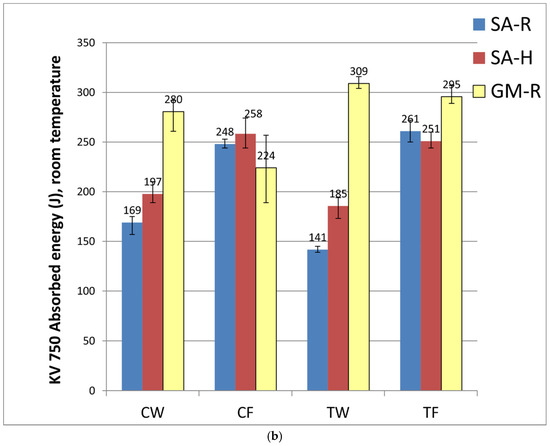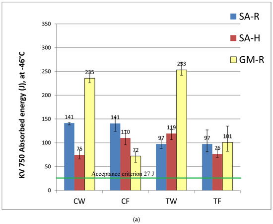 Regarding the impact toughness results (Figure 15), all the coupons exceeded the requirements regardless of the welding process used and the arc energy conditions. The GM-R weldment showed the highest absorbed energy values at both temperatures tested and in all the locations tested, except for the HAZ in the bulk weld (center, Figure 1). The HAZ in the GM-R weld experienced a larger number of reheating cycles than in the SAW weldments, and a high concentration of nitrides was observed (Section 3.1.1). That might explain the lower value in the HAZ of GM-R, but still above the requirement.