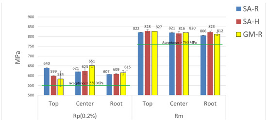 Results of the transverse tensile test: Yield strength (Rp 0.2%) and tensile strength (Rm) values are plotted versus the testing location. Test locations defined in Figure 1. The error bars refer to the standard deviation of the mean value in each set of experiments.