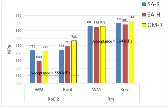 Results of the longitudinal tensile test: yield strength (Rp 0.2%) and tensile strength (Rm) values are plotted versus the testing location. WM is the bulk weld metal from the center of side 1, and Root refers to the weld metal in the X-root.
