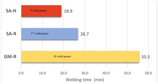 The welding time to produce a complete weldment for each experiment was calculated by considering the number of passes, the length of the welds (0.5 m), and the welding speed for each pass (Table 2). Only the time that the arc was ignited was considered for the calculations. Results are shown in Figure 18. The shortest welding time was achieved by using SAW with a higher than recommended arc energy (18.9 min for SA-H), whilst the experiment with the longest welding time corresponded to the GMAW with the recommended arc energy (55.5 min for GM-R). Experiments GM-R and SA-R had nearly the same number of welding passes (18 and 17, respectively), and both were prepared with recommended arc energy and interpass temperature, but the welding time for the GMAW weldment (55.5 min) was twice the welding time needed to prepare the SAW weldment (26.7 min).