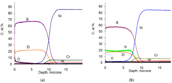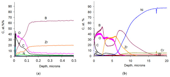 Both coatings 1 and 2 resisted oxidation at 600 °C. According to the GDOES data, the penetration depth of the oxygen atoms in coatings 1 and 2 was 120 and 90 nm, correspondingly. The composition of the upper layer was based on the zirconium dioxide with minor retention of boron. The main volume of boron apparently evaporated from the surface in form of the volatile oxide B2O3 [73,74]. Upon the increase of the temperature to 800 °C the coating 2 suffered complete oxidation and transformed into a porous oxide layer with poor strength and adhesion towards the substrate (the oxide layer was destroyed by a single measurement on spectrometer). The low oxidation resistance of the coatings in the Zr-B-N system is related to the formation of oxides of boron and nitrogen upon heating in air. These oxides have high saturated vapor pressure at 800 °C and therefore evaporate rapidly and compromise the structural integrity of the coatings [75,76]. The heating of N-free coating 1 up to 800 °C resulted in the formation of a 2–2.5 µm thick upper oxide layer based on boron oxide. Under this upper layer lies an intermediate 3 µm thick layer consisting of the mixture of ZrO2 and B2O3 and an oxygen-free layer, which consists of Zr, B and a minor amount of Ni from the substrate, underneath which lies the substrate itself (a nickel alloy based on Ni, Cr and W). The as-formed layered structure possessed high strength.