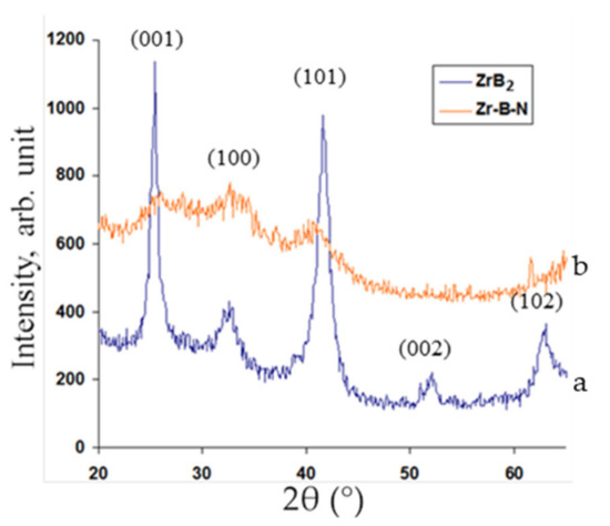 From the industrial point of view, ZrB2 and Zr-B-N–based coatings are prospective candidates for application due to their hardness of 22–29 GPa [19,20], high adhesion (critical stress of 80 N) [20]. ZrB2–based coatings can be produced by a wide variety of techniques, including plasma deposition [21,22,23], diffusion saturation [24], salt electrolysis [25], electrospark deposition [26,27], chemical vapor deposition [28] and arc-PVD [29]. Magnetron sputtering offers several advantages, including low surface roughness, substrate geometry retention [30,31], low content of pores and structural defects [32,33], high adhesion to the substrate when the preliminary ion etching is applied [34,35,36], precise control of the structural characteristics via the adjustment of the sputtering parameters [37], the versatility of the used substrates [38,39,40,41] and uniform depth-wise distribution of the elements in the multi-element coatings [41,42,43].