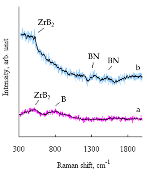 According to the XRD data, coating 1 contained a single crystalline phase h-ZrB2. The introduction of 21%N into ZrB2 coatings did not result in the formation of any nitrogen-containing crystalline phases. Since the atomic ration B/Zr = 3.2–3.4, both coatings 1 and 2 contain excess boron. Therefore, one might expect the formation of amorphous structural constituents, which cannot be traced by XRD (such as B and BN). Raman spectroscopy of coating 1 demonstrated the presence of ZrB2 (peak at 514 cm−1) [50], as well as free boron (intensely widened peak at ~800 cm−1) [51]. Coating 2 in addition to the peak at 515 cm−1 shows peaks at 1343 and 1535 cm−1, which are characteristic of the BN phase [52,53] (Figure 4).