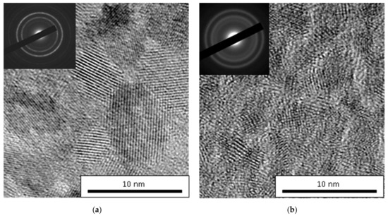 The SAED patterns of coating 2 show significantly broadened lines; however, the interplanar spacings (d-spacings) measured from the location of the center of each line were close to that of coating 1 and were equal to 0.325, 0.269 and 0.209 nm, which corroborates the presence of h-ZrB2 phase. The introduction of nitrogen decreases the grain size of the crystalline phase to 1.5–3.5 nm and the formation of prominent 1–2 nm wide amorphous interlayers (Figure 5b). A similar effect of grain refinement was previously reported [56,57]. According to the TEM data for coating 2, the reflexes have interplanar spacings of 0.238 and 0.250 nm, which can correspond both to the ZrB2 and cubic ZrN, i.e., we cannot exclude the possibility of ZrN formation. The volume ratio of such crystallites was approx. 7%.