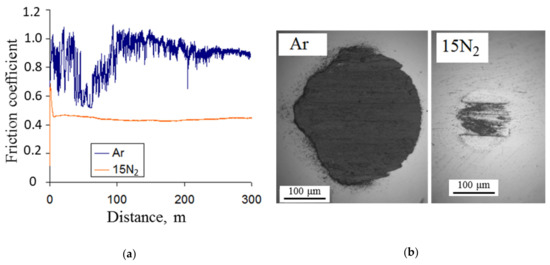 Experiments demonstrated that nitrogen-free Zr-B coatings display a higher friction coefficient as compared to reactive N-doped coatings. In the first case, during the 0–10 m distance, the friction coefficient reaches 0.8–0.9 and occasionally rises to 1.1 (Figure 6a).