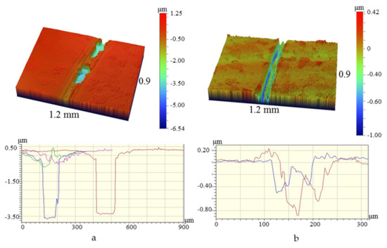 3D and 2D profiles of the wear tracks for coatings 1 (100%Ar) (a) and 2 (85%Ar + 15%N2) (b).