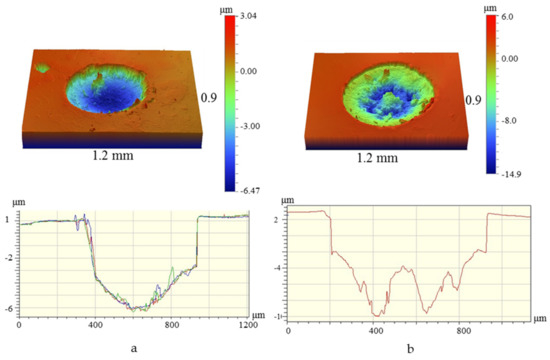 N-free coatings demonstrated higher resistance towards dynamic loads: the depth of wear holes was ~7 µm, with 550 µm diameter (Figure 8).