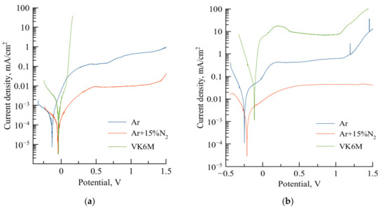The results of electrochemical testing of coatings and uncoated substrate VK6M (WC–6%Co) in water solutions of 3.5% NaCl and 1 N H2SO4 are demonstrated in Figure 9 as polarization curves in semi-logarithmic coordinates. The free corrosion potential E and corrosion current density Icorr are provided in Table 2.