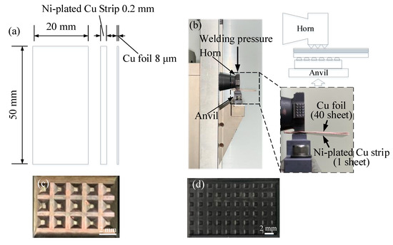 The welding test specimens, 20 mm in width × 50 mm in length × 8 μm and 0.2 mm in thickness, as shown in Figure 2a, were used to perform the T-peel test for the weldability evaluation. As shown in Figure 2b, the welding was performed by placing one layer of the nickel-plated copper strip on the anvil side and 40 layers of Cu foils, which were arranged to overlap on the horn side to which vibrations were applied. The horn and anvil used in the experiment were fabricated as shown in Figure 2c,d for the stable welding of the 40 Cu foil sheets and the Cu–Ni strip.