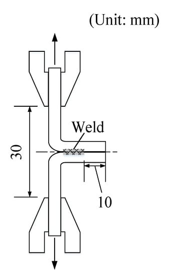 There is no international standard for the evaluation of the multilayered joints manufactured by ultrasonic welding, and the T-peel test was employed to measure the strength of the joints. The weld strength was determined as the maximum load until failure on the load-displacement curve. The equipment for the T-peel test consists of a motorized test stand (MX2-500N, Imada, Aichi, Japan) and a digital force measurement gauge (DS2-500N, Imada, Aichi, Japan). For the T-peel test, ultrasonic-welded samples were bent 90 degrees in both directions by separating a tab and 40 sheets to form a T shape shown in Figure 3. The 40 foils were held by the upper grip and a tab by the lower grip. The test was carried out at room temperature with a crosshead speed of 50 mm/min.