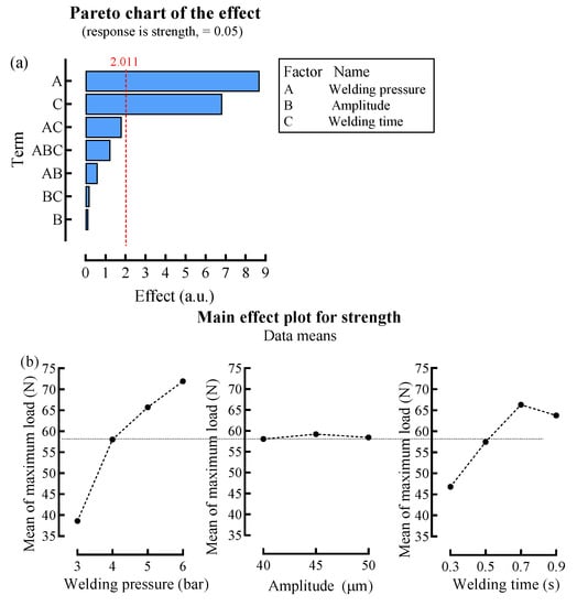 Figure 6a,b present the comparison of the relative magnitude and statistical significance of both the Pareto chart and its main effects. In the Pareto chart effect of Figure 6a, the effects of the welding pressure, A, and the welding time, C, are statistically significant (α = 0.05). Furthermore, the effect of A (welding pressure) is the largest, and the effect of B (amplitude) is the least in the graph. For the main effect of each factor in Figure 6b, the average strength increases with the increase in the welding pressure, but the average strength is not significantly affected by the amplitude. Additionally, the highest average strength is obtained at a welding time of 0.7 s.