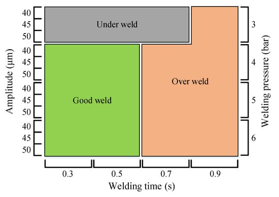 The UMW process variables include the welding time, amplitude, and welding pressure. This experiment was conducted under the conditions listed in Table 1 to derive the welding lobe area of the target material.