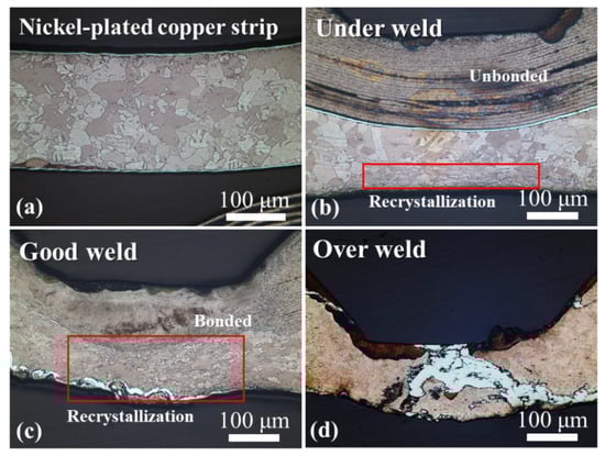 Figure 8 shows the etched cross-sectional images illustrating the grain size and material bonding corresponding to the welding quality. The etching solution is prepared by mixing distilled water, ammonium hydroxide, and hydrogen peroxide in a volume ratio of 5:5:1. Figure 8a shows the structure of the Ni-coated Cu base metal. The under weld is separated by a coating layer between the foil and the strip, and there is an unbonded region at the interface between the foils, as shown in Figure 8b. At the lower end of the strip, a recrystallization zone is formed due to deformation and frictional heat produced during the ultrasonic welding. The bond between the foil layers and the metallurgical bond between the strip and the foil are formed in the weld as shown in Figure 8c. Overall, the recrystallization zone expands, and the micronized crystal grains are observed. The deformation and the Ni layer movement due to the excessive energy flow are shown in Figure 8d.