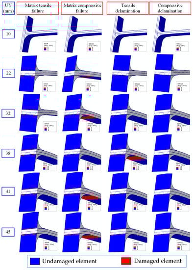 - A finite element analysis method was established based on the 3D-Hashin damage initiation criterion and Chang-Chang damage evolution criterion. The web’s failure mode was the compressive matrix failure and the damage on the lower connector was the fiber compressive failure when the joint reached its maximum load-bearing capacity.