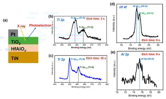 Figure 1a shows a schematic of the Pt/TiO2/HfAlOx/TiN device. XPS analysis was performed as the X-ray was incident from the TiO2 surface, and analysis was conducted on the inner thin film through Ar+ etching. Overall, ALD-deposited film had better stoichiometry compared with films deposited by other sputtering systems [35]. Figure 1b,c shows the Ti 2p spectra for an etch time of 2 s and an etch time of 35 s, which correspond to the TiO2 layer and the TiN bottom electrode, respectively. The Ti 2p XPS spectra included Ti 2p3/2 and Ti2p1/2, as shown in Figure 1b,c. The peak binding energies of Ti 2p3/2 and Ti 2p1/2 were located at approximately 458.94 eV and 464.5 eV for Ti-O bonds [36]. However, the peak binding energies of Ti 2p3/2 and Ti 2p1/2 were found at approximately 454.92 eV and 460.93 eV for Ti-N bonds [37]. Figure 1d shows the Hf 4f spectra at an etch level of 9. Hf 4f7/2 and Hf 4f5/2 doublet peaks were found at 18.63 eV and 20.03 eV, respectively, for Hf-O bonds in the Hf-dominated HfAlOx film. Figure 1e shows the Al 2p spectra at an etch time of 9 s. Because the Al content was low in the HfAlOx film, the Al intensity was low and some noise was observed, but a distinct peak was observed for the Al-O bond at approximately 75.4 eV [12].