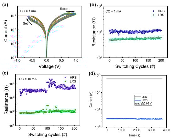 Figure 2. (a) I–V characteristics of the Pt/TiO2/HfAlOx/TiN RRAM device. (b) Endurance at a compliance current (CC) of 1 mA in the high-resistance state (HRS) and low-resistance state (LRS). (c) Endurance at a CC of 10 mA. (d) Retention characteristics for 3600 s.