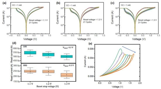 Figure 3. I–V characteristics of the Pt/TiO2/HfAlOx/TiN RRAM device at reset stop voltages of (a) 1.1 V, (b) 1.2 V, and (c) 1.3 V. (d) Read current distribution as a function of reset stop voltage. (e) MLC by reset stop voltage.