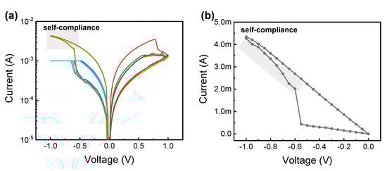 Figure 4. Self-compliance characteristics of the Pt/TiO2/HfAlOx/TiN RRAM device: (a) log-scale; (b) linear scale.