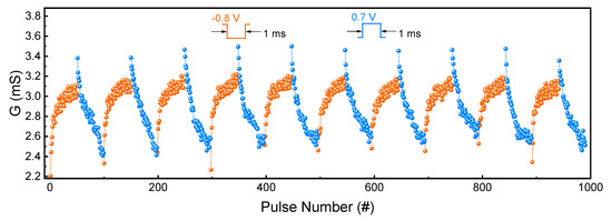 Next, the potentiation and depression characteristics were mimicked to apply the Pt/TiO2/HfAlOx/TiN device to a neuromorphic system. For potentiation, repetitive pulses with a voltage of −0.8 V and a width of 1 ms were used, as shown in Figure 5. Figure S1 shows the transient characteristics of the set and reset process. A low read pulse voltage (0.3 V) was used to not affect the conductance change during the reading. It should be noted that for gradual conductance modulation in the self-compliance region, we demonstrated 10 cycles of long-term potentiation and long-term depression, and found no significant degradation of the MLC.
