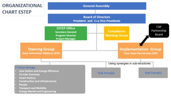 ESTEP was formed in 2003 as one of the first European technology platforms and brings together all the major stakeholders in the European steel industry. The members comprise major steel manufacturers, universities, and research institutions that are active in steel research; major users of steel, such as car manufacturers; and public bodies, such as the European Commission and national governments. Since 2018, ESTEP has been a non-profit organization according to Belgian law (international ASBL) [4]. The mission of ESTEP is to engage in collaborative EU actions and projects on technologies that are tackling EU challenges (notably on renewable energy, climate change, i.e., low-carbon emissions, and CE) to create a sustainable EU steel industry. This is done by disseminating the results of projects, facilitating a supportive environment for collaborative projects, and the active network of ESTEP’s community. Figure 1 shows the organizational structure of ESTEP [4].