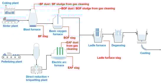 Figure 3 shows the basic aggregates of the BF-BOF and EAF routes (coupled with direct reduction as a prior upstream primary process), with the main residues and their place of generation. In the following subsections, different processes for residue valorization that are currently under investigation are mentioned.