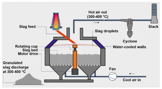 One concept for the dry slag granulation (DSG) of BF slag operates with a rotating disc that is placed in a reactor with water-cooled walls (see Figure 9 [29,30]).