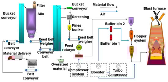 Flowchart of a waste plastic injection plant at a blast furnace [40,41].