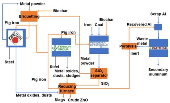 Industrial symbiosis is the focus of the currently ongoing EU-funded project CORALIS (H2020 SPIRE Program, grant agreement number 958337) [45]. CORALIS will create new value chain relations through novel approaches that facilitate long-term industrial symbiosis. Three industrial use cases will be studied within the CORALIS project. In the Brescia (Italy) case (see Figure 15), a steel producer, a foundry, and a partner from the aluminum industry are cooperating to recover metal fractions from waste, along with evaluating the use of the residue as secondary raw materials. Furthermore, biochar utilization as a carbon substitute will be investigated and waste heat utilization potentials will be analyzed [45].