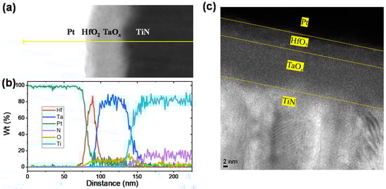 Figure 1a,b shows a scanning transmission electron microscopy (STEM) image and EDS line scan of the Pt/HfO2/TaOx/TiN device. The two insulators (HfO2 and TaOx) can be distinguished through the contrast in STEM values, as shown in Figure 1a. Figure 1b shows Wt (%) as a function of the distance obtained by EDS line scan for Hf, Ta, Pt, N, O, and Ti. Figure 1c shows a high-resolution TEM image of the Pt/HfO2/TaOx/TiN device. The thicknesses of HfO2 and TaOx are about 7 nm and 20 nm. The polycrystalline TiN layer and the amorphous HfO2 and TaOx layers can be clearly observed in the TEM image.