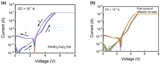 I–V characteristics of Pt/HfO2/TaOx/TiN RRAM device. (a) Ten cycles in one cell and (b) first curves of 10 cells.