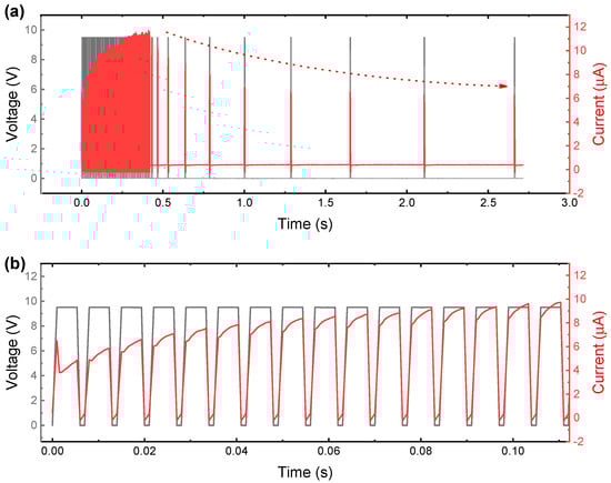 Next, we conduct pulse measurements to obtain the short-term memory characteristics for practical device operation. The natural reduction in current is important in short-term memory. The pulse inputs are designed by controlling the pulse interval time between pulses to observe the current accumulation and decay, as shown in Figure 3. For the accumulation curve, a strong signal input should be provided, and this is also the case for the decay curve. On the other hand, a weak signal input should be entered into the device. To begin, 60 pulses with a voltage of 9.5 V were applied at an interval of 0.001 s. In this short interval time condition, the current is gradually accumulated. The increase in current can be clearly identified through the magnification of 16 pulses. However, the increased current is decayed when increasing the interval from 0.01 s to 0.055 s. Finally, the state of the device returns to its initial state, thus showing the short-term memory effect. These results indicate that even if pulses of the same voltage are applied, how frequently they are applied can further determine the conductance accumulation and attenuation. In other words, the dynamics of increasing of oxygen vacancies by pulse and the natural decrease in oxygen vacancies can be controlled.